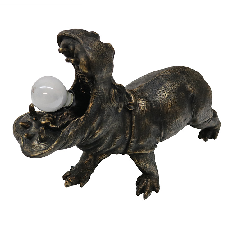 Introducing the Hippo Table Lamp – a unique blend of black and bronze resin that will add a touch of whimsy and style to any room. With its bulb coming out of the mouth, this lamp is sure to make a statement. Illuminate your space with this fun and functional piece!
